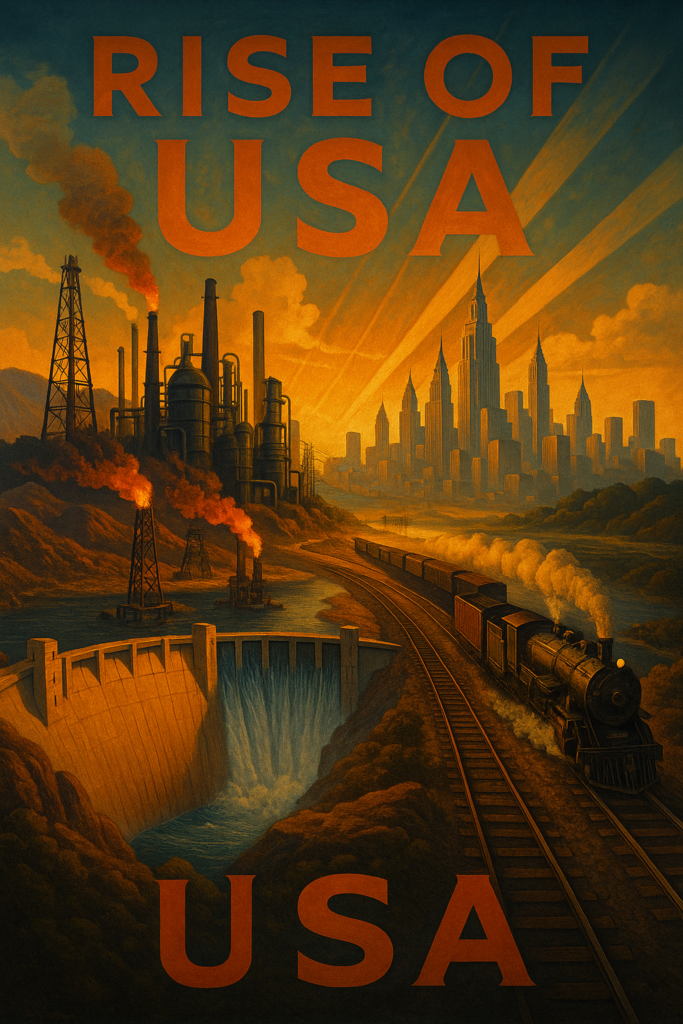 No início do século XIX, o carvão americano era tão acessível que permitiu aos EUA induzirem uma revolução industrial paralela à europeia, porém com custos menores. Esse carvão energizou ferrovias, siderúrgicas, locomotivas, caldeiras, navios e todo o esqueleto produtivo da nova nação. Linhas ferroviárias se estendiam como artérias metálicas que cortavam o continente, transformando distância em oportunidade. Foi energia.