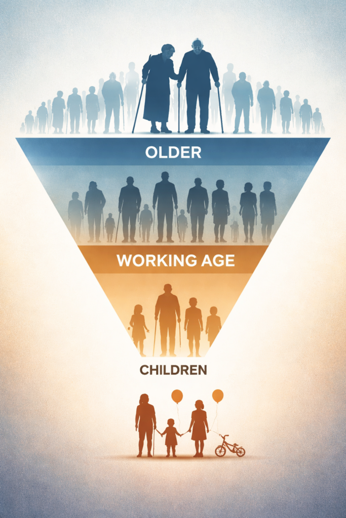 But the inversion of the age pyramid rewrites everyday assumptions. It reshapes neighborhoods, job markets, family dynamics, and political incentives. It changes what stability means.